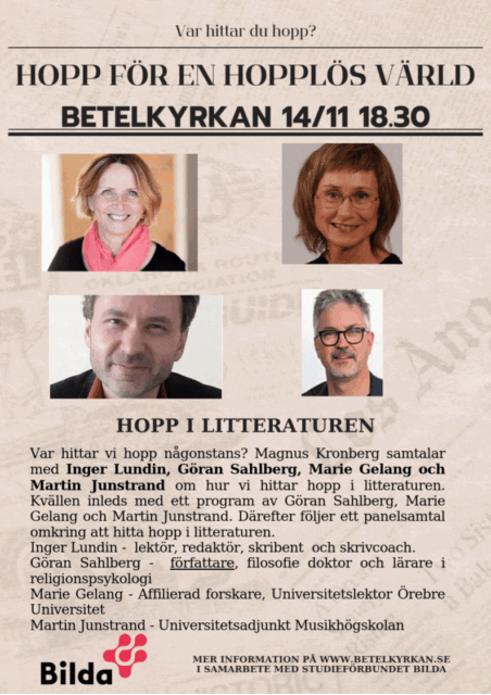 Hopp i litteraturen Var hittar vi hopp någonstans? Magnus Kronberg samtalar med Inger Lundin, Göran Sahlberg, Marie Gelang och Martin Junstrand om hur vi hittar hopp i litteraturen. Kvällen inleds med ett program av Göran Sahlberg, Marie Gelang och Martin Junstrand. Därefter följer ett panelsamtal omkring att hitta hopp i...