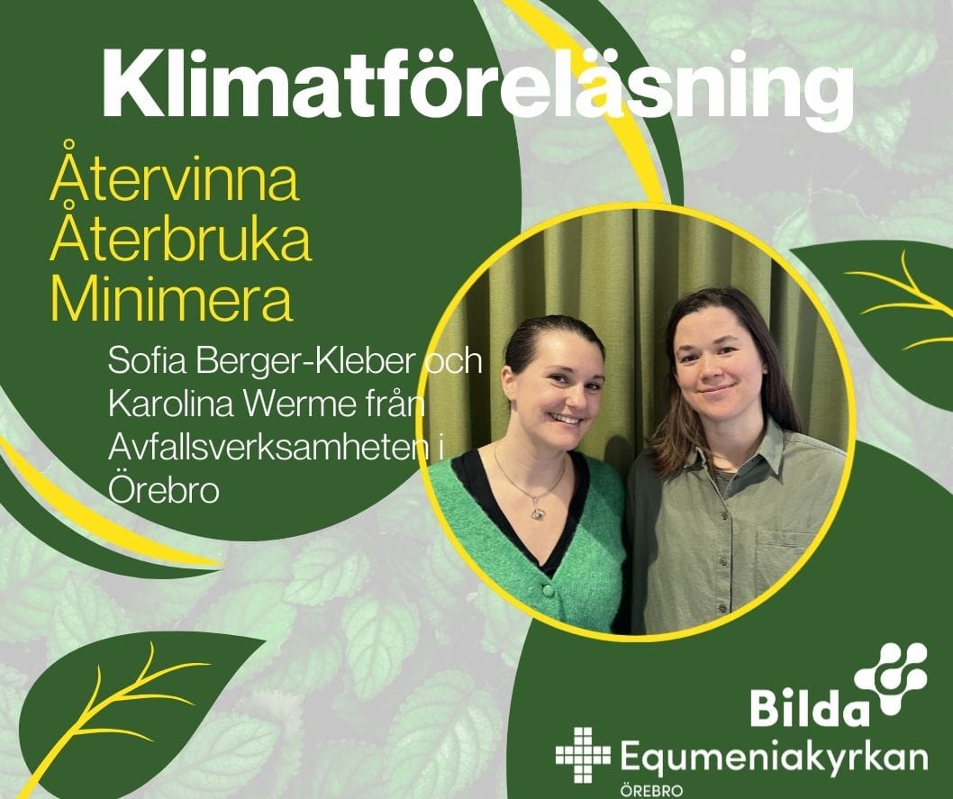 ![]() ![]() Välkommen till föreläsning med tema Återvinna-återbruka-minimera Sofia Berger-Kleber och Karolina Werme från Avfallsverksamheten i Örebro kommun berättar om sitt arbete torsdag 22/1 kl 18. Soppa serveras från kl 17. |