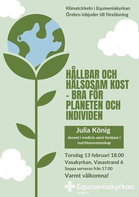 Klimatföreläsning i Vasakyrkan med Julia König Hållbar och hälsosam kost- Bra för planeten och individen. Soppa serveras från 17:00 Föreläsning 18:00