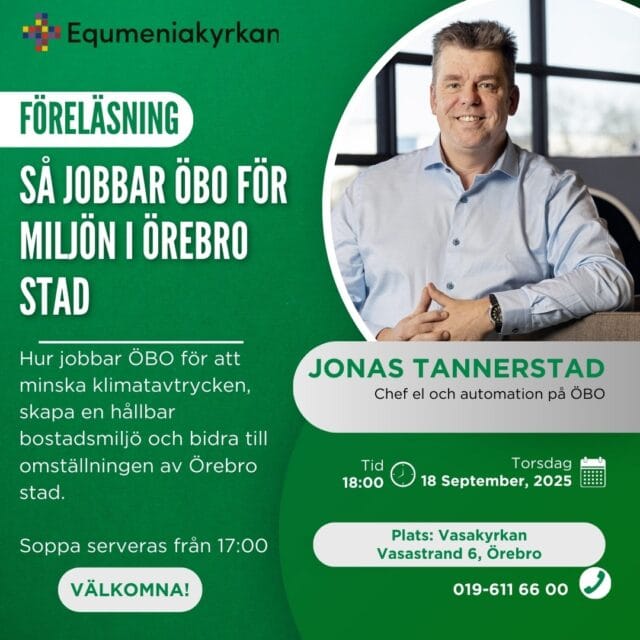Jonas Tannerstad kommer och föreläser om ÖBO arbete för att minska klimatavtrycken, och skapa en hållbar bostadsmiljö samt bidra till omställningen av Örebro stad. Soppa från 17:00 Föreläsningen börjar 18:00